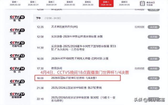 孙颖莎那场正好在这个时段,晚间六点整CCTV5接力,陈幸同、王楚钦、王曼昱接连出战,球迷们记得守在电视机前,一起见证国乒冲击四强。